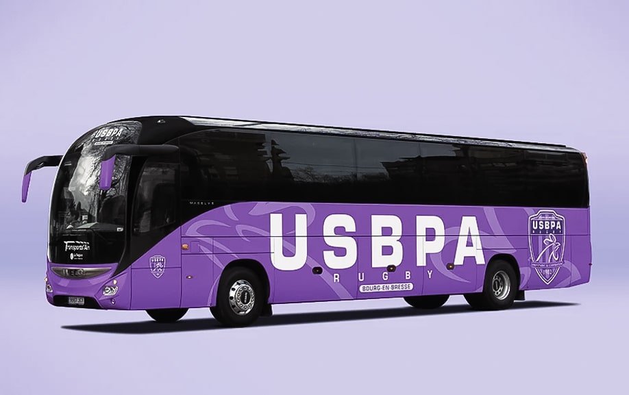 Le covering autocar club réalisé pour l’USBPA Rugby illustre le savoir-faire de SPORTSIGN dans la création d’habillages grand format dédiés aux équipes professionnelles. Le transporteur Transport de l’Ain souhaitait disposer d’un autocar moderne, immédiatement identifiable et fidèle à l’identité visuelle du club de Bourg-en-Bresse. Notre intervention a porté sur la conception du design, l’impression grand format et la pose sur l’ensemble du véhicule. Destiné aux matchs à l’extérieur et aux déplacements officiels, l’autocar arbore désormais une livrée lisible, cohérente et robuste, pensée pour refléter l’esprit du club violet lors de chaque sortie.