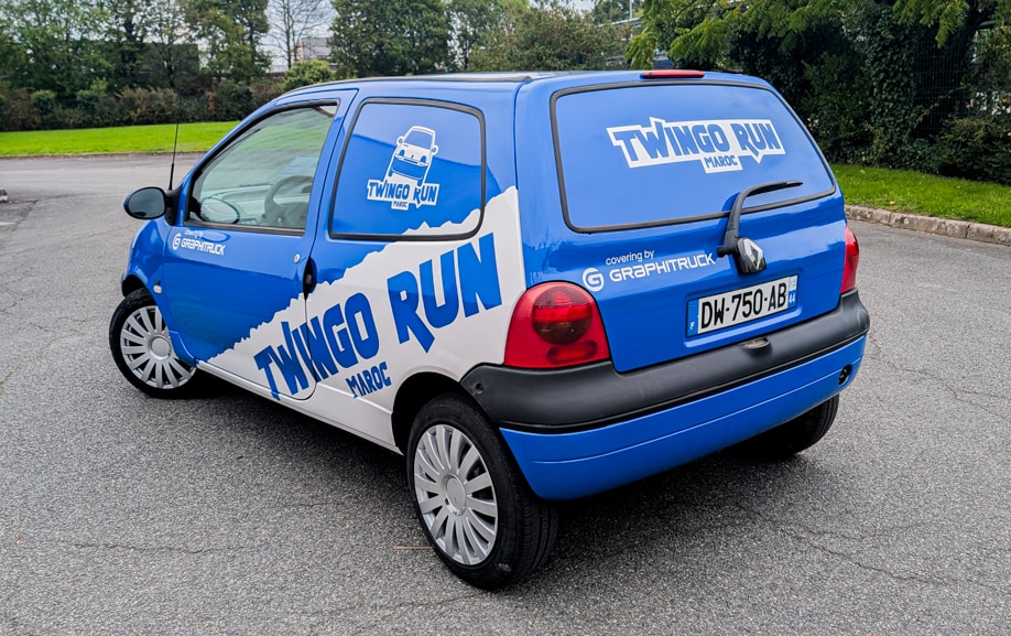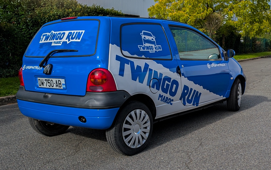 Pour préparer l’édition 2026 du Twingo Run Maroc, un participant nous a confié sa Renault Twingo. Objectif : transformer une citadine en support de course lisible et cohérent, sans alourdir le véhicule. Nous avons réalisé un covering événement course intégral : impression des aplats bleus, découpe des lettrages, puis pose sur carrosserie et vitrages selon les zones. Avant la pose, nous avons dégraissé, contrôlé les alignements et validé un BAT. Le vinyle épouse les courbes, résiste aux UV et se nettoie facilement. Ce covering événement course met en avant le logo “Twingo Run”. Nous avons soigné les jonctions, les reprises d’arêtes et les zones sensibles.