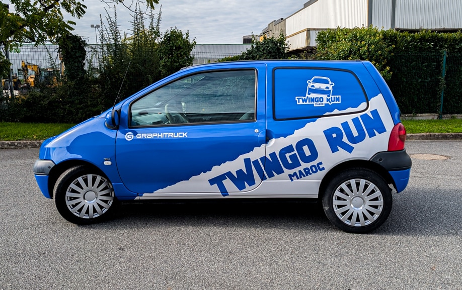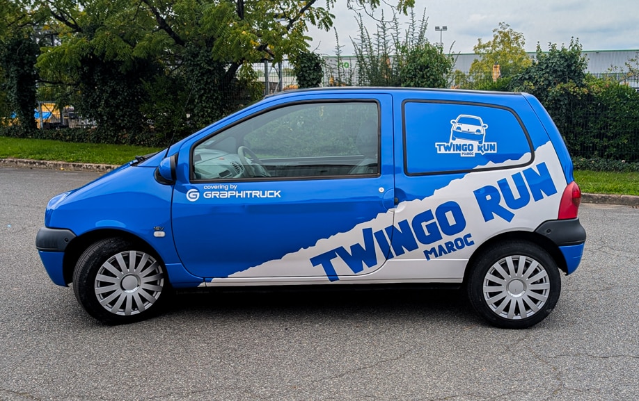 Derrière ce projet, un particulier engagé sur le Twingo Run Maroc 2026 (twing-raid.com). Sa Twingo devait devenir un repère visuel sur route et sur piste, tout en restant exploitable au quotidien. Le défi : garder une lecture nette du nom de l’équipage / événement, même à distance, et tenir dans des conditions exigeantes (UV, poussière, lavages répétés, frottements). Le covering devait aussi respecter les zones vitrées et les ruptures de carrosserie, sans “casser” la ligne graphique.