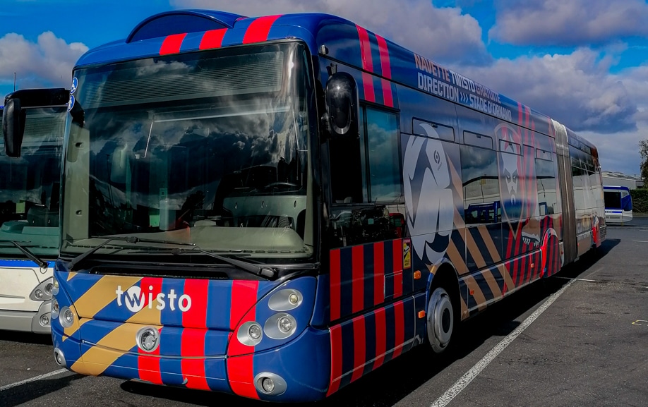 Pour cette opération Twisto x SM Caen, nous avons réalisé un flocage bus événementiel sportif en covering intégral afin d’obtenir un rendu lisible, dynamique et cohérent sur l’ensemble du bus-navette… y compris sur une version articulée.