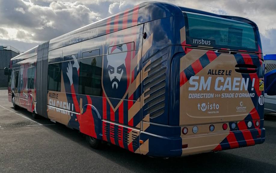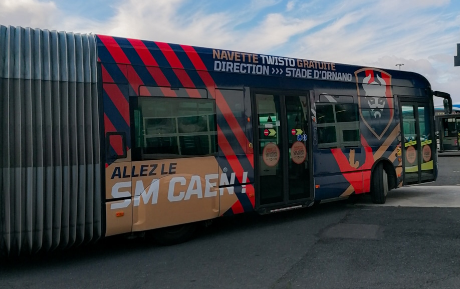 Twisto, réseau de transport de l’agglomération de Caen, exploite une navette dédiée aux jours de match pour acheminer les supporters vers le Stade Michel d’Ornano. L’enjeu était double : rendre le service immédiatement identifiable (“navette gratuite / direction stade”) et transformer le véhicule en support de communication à fort impact, cohérent avec l’univers graphique du SM Caen (bandes, couleurs, emblèmes, messages).