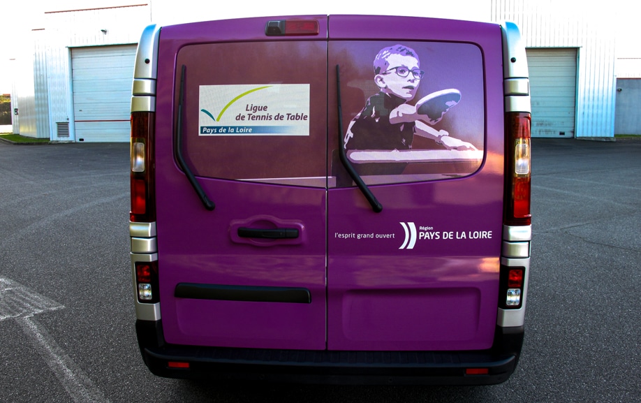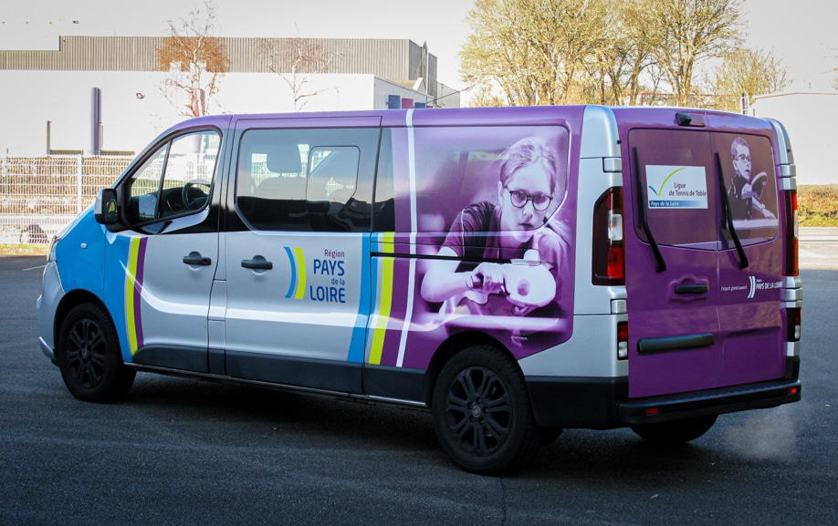 Pour la Ligue de Tennis de Table des Pays de la Loire, le minibus représente bien plus qu’un simple moyen de transport : c’est un vecteur d’image essentiel lors des déplacements des jeunes athlètes et de l’encadrement. La demande portait sur un habillage capable d’unifier communication institutionnelle et expression sportive, tout en restant cohérent avec les codes graphiques régionaux. Le défi consistait à concevoir un visuel percutant, facilement identifiable, et compatible avec un covering semi-intégral sur un véhicule très sollicité au quotidien.