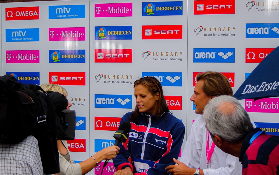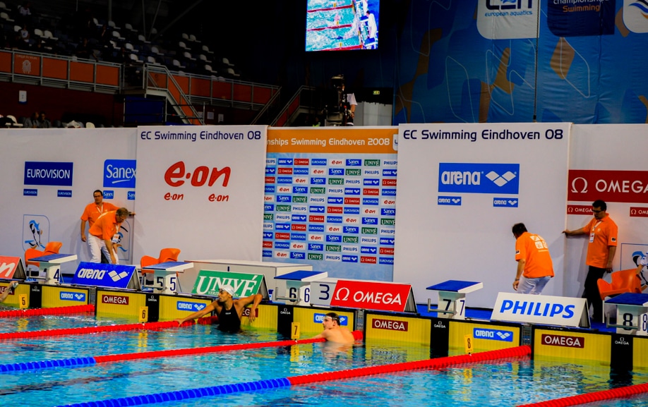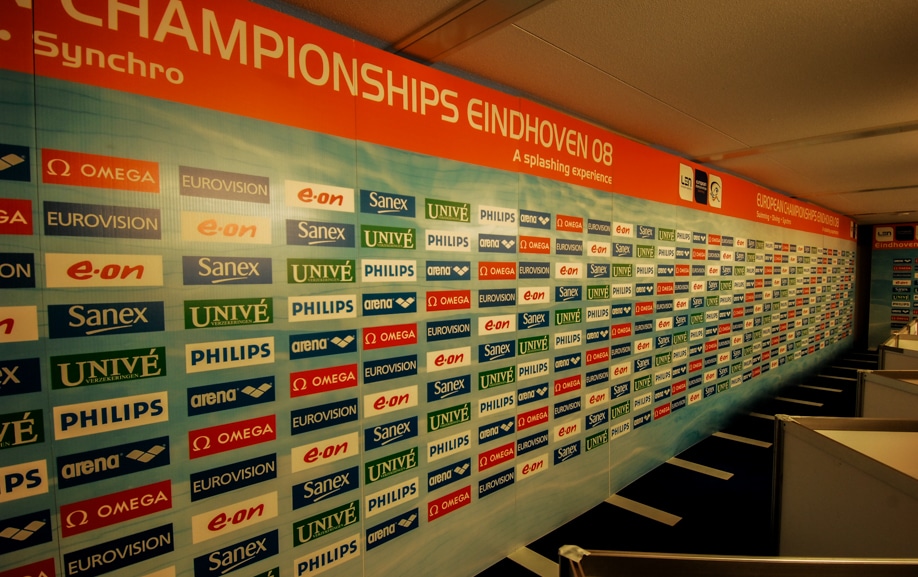 European Aquatics pilote l’organisation et la mise en scène des grandes compétitions aquatiques européennes. À Eindhoven, lors des Championnats d’Europe de natation 2008, la zone médias devait être à la hauteur de l’événement : un espace clair, identifiable et immédiatement prêt, aussi bien pour les interviews rapides que pour les prises de parole plus longues.