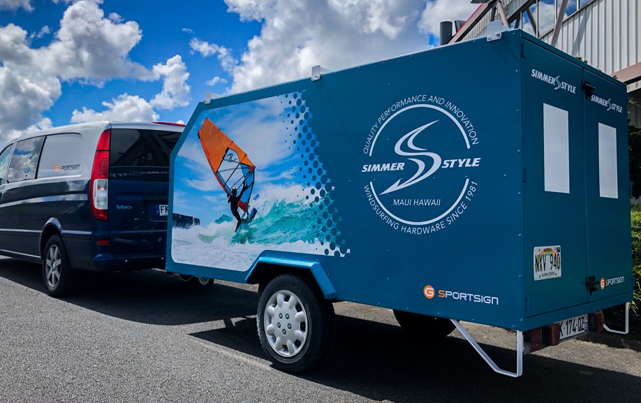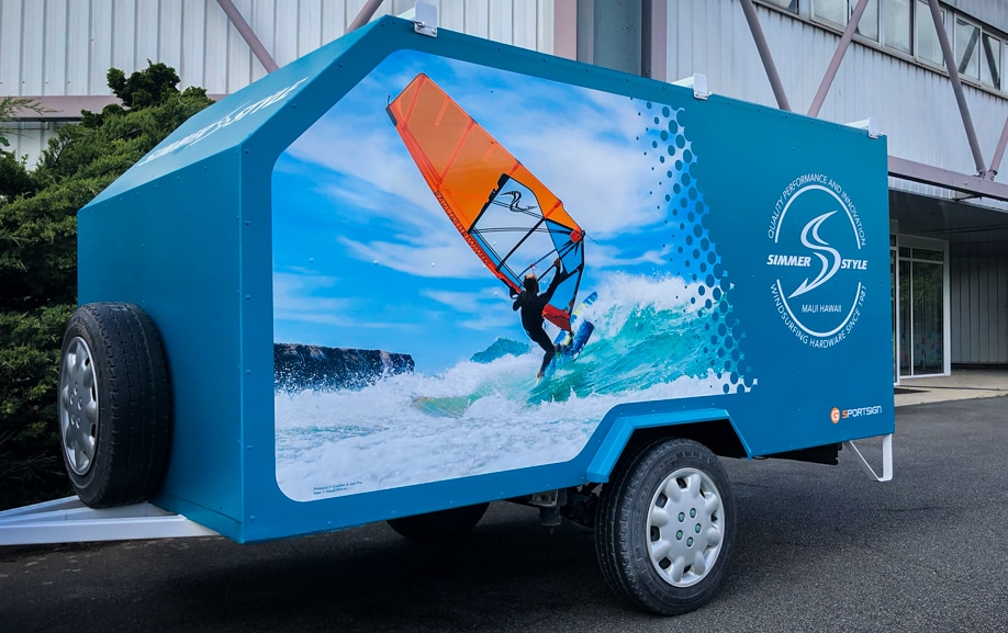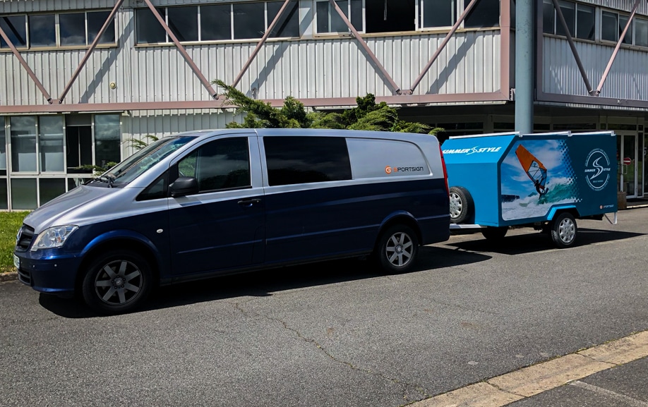 Côté exécution, SPORTSIGN a pris en charge la préparation des fichiers, la production en impression grand format, puis une pose soignée avec repérage, marouflage et finitions sur les zones sensibles (arêtes et ruptures de forme). Résultat : une personnalisation de remorque sportive cohérente, “pro”, et pensée pour durer sur la route comme sur les spots.