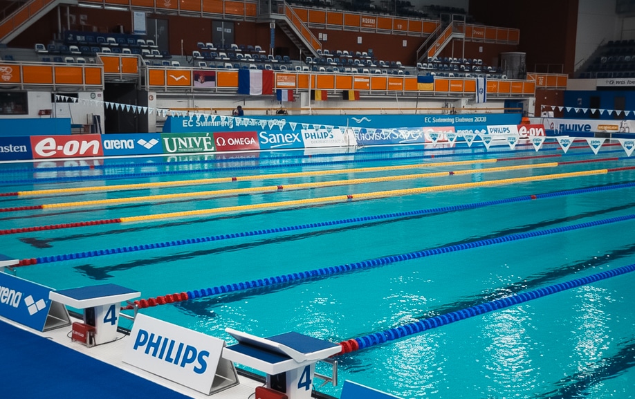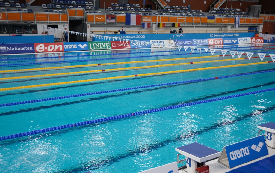 Toblerones publicitaires visibles au bord d’une piscine de championnat
